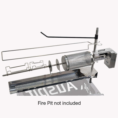 The Australian patented carrier‚ bracket is the key component that separates the Auspit apart from the others that have tried to copy this system and sell it on the Australian market. Together with the squeeze lock. It allows you to adjust the height of the skewer‚ for the ideal cooking height over the fire and allows you to swing the skewer over the fire and then locks in place so it can't slowly swing away. The counter leaver skewer design and nylon support in the carrier bracket ensure minimal strain is placed on the drive motor bush, giving‚ this spit great efficiency, improving reliability‚ and in turn also‚ improving the longevity of the motor.