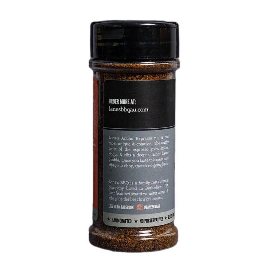 Lanes BBQ Seasonings - Ancho Espresso 113g/298g is our most unique & creative rub. The earthy twist of the espresso gives steaks, chops & ribs a deeper, richer flavor profile.