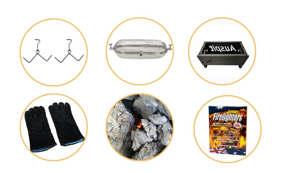 Here is a handy checklist to get you started. You might need a new motor with higher capacity like 10kg or 18kg options for heavier cuts, spare prongs, spikes, or leg brackets, a basket cage for wings, veg or seafood, a fire pit or charcoal tray, a carving shovel (To view products, head over to BBQ Spit Rotisseries here), long tongs or heat-resistant gloves, and charcoal, firelighters, and backup batteries.