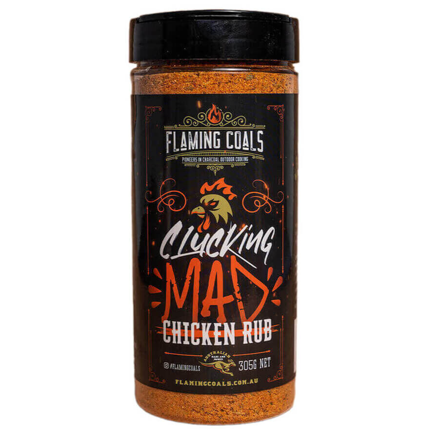 Flaming Coals Clucking Mad Chicken Rub is an amazing combination of herbs and spices that will cause your taste buds to explode. Whether you're cooking whole chickens, breast or thigh, the Flaming Coals Clucking Mad chicken rub is to be a winner for the entire family