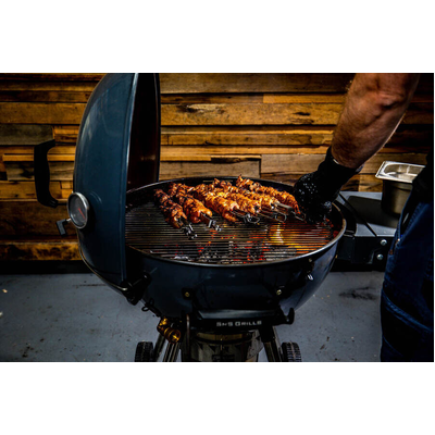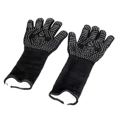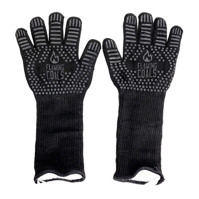 Flaming Coals' Long Sleeve Heat Resistant BBQ Gloves are heat and melt resistant, making them the perfect companion for cooking in high temperatures. They also have silicone strips that go across the gloves. This provides a non-slip grip for when you are picking up items off your BBQ, lifting up rub shakers or opening lids.